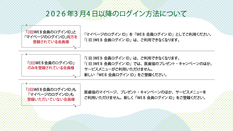 2026年3月3日以前に「マイページ・ログインID」を取得されていない会員様は、従来の「WEB会員・ログインID」では、ホームページを経由した医歯協のサービスがご利用いただけなくなります。
