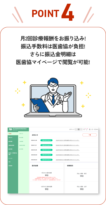 - A振込明細は「医歯協マイページ」にて、Web上でのご確認となります。紙での発行や郵送は承っておりませんので、予めご了承ください。