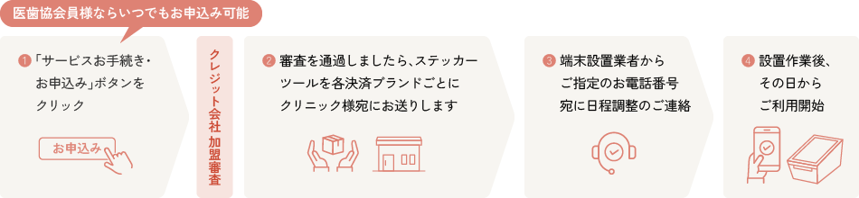 - Aお申込みをいただき、クレジット会社の加盟審査が終了した時点で、クリニック住所に郵送されます。