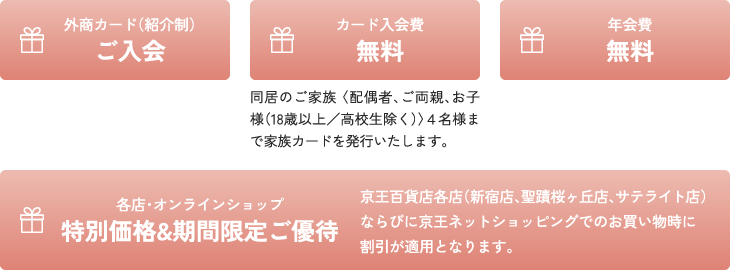 京王百貨店と提携して、特別価格でお買い物ができる割引カードを発行しております。通常はご紹介制の外商カードですが、当組合会員の先生は医歯協経由なら特別にお申込みいただけます。カード入会費・年会費は無料。ぜひご活用ください。