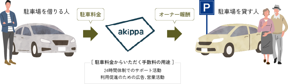 akippaが駐車場の登録・掲載を行い、利用されるとakippaからオーナーに報酬が支払われます。